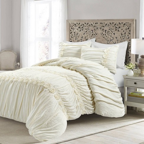 Lush Decor Ruffle Stripe Textured Ruched Shabby Chic Farmhouse 3 Piece Bedding King White 3piece Comforter Set